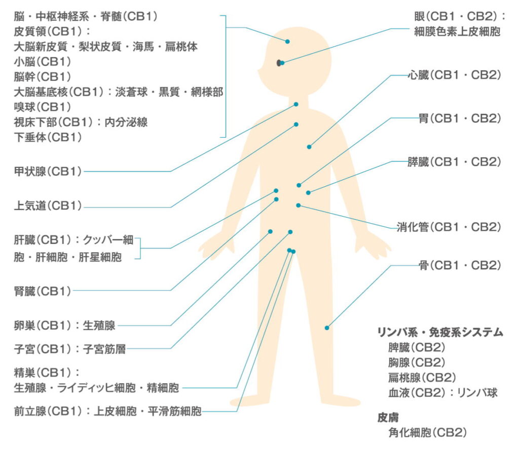 カンナビノイドを取り込むことに特化した受容体で、身体中に分布しそれぞれ異なる働きをしています。