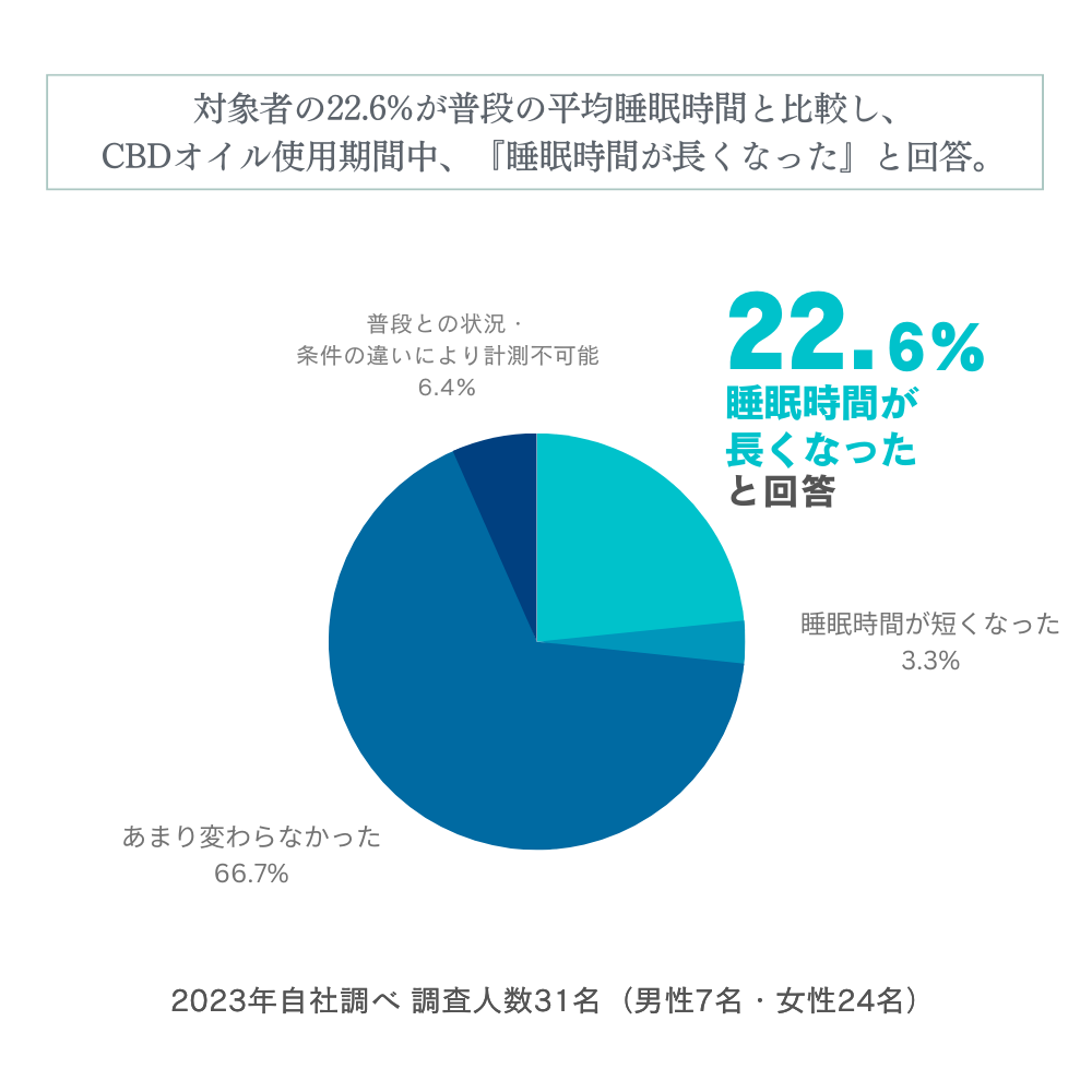 普段の平均睡眠時間と比較し、Bicle CBDオイル使用期間中、『睡眠時間が長くなった』と回答した対象者は22.6%でした