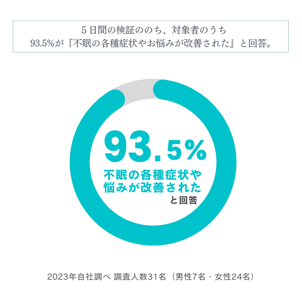 5日間の検証ののち、対象者のうち93.5%が『不眠の各種症状やお悩みが改善された』と回答