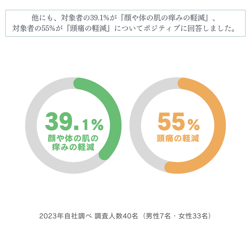 他にも、対象者の39.1%が『顔や体の肌の痒みの軽減』、対象者の55%が『頭痛の軽減』についてポジティブに回答しました。
