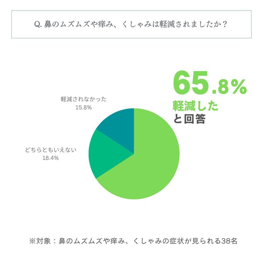 「鼻のムズムズや痒み、くしゃみは軽減されましたか?」という問いに対し、症状が見られる対象者の65.8%が『はい』と回答。