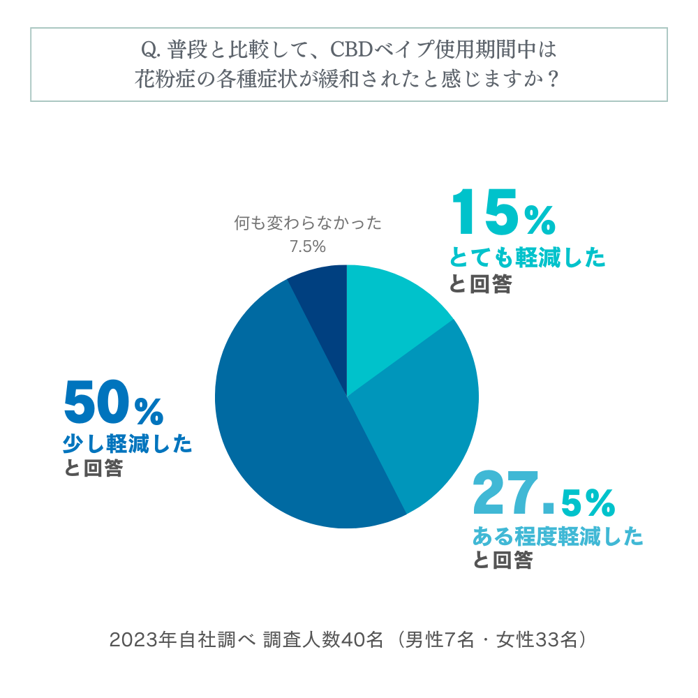 BicleエニタイムCBDベイプを使用した対象者の92.5%が、CBDベイプ使用期間中は花粉症の各種症状が『緩和された』と回答しました。