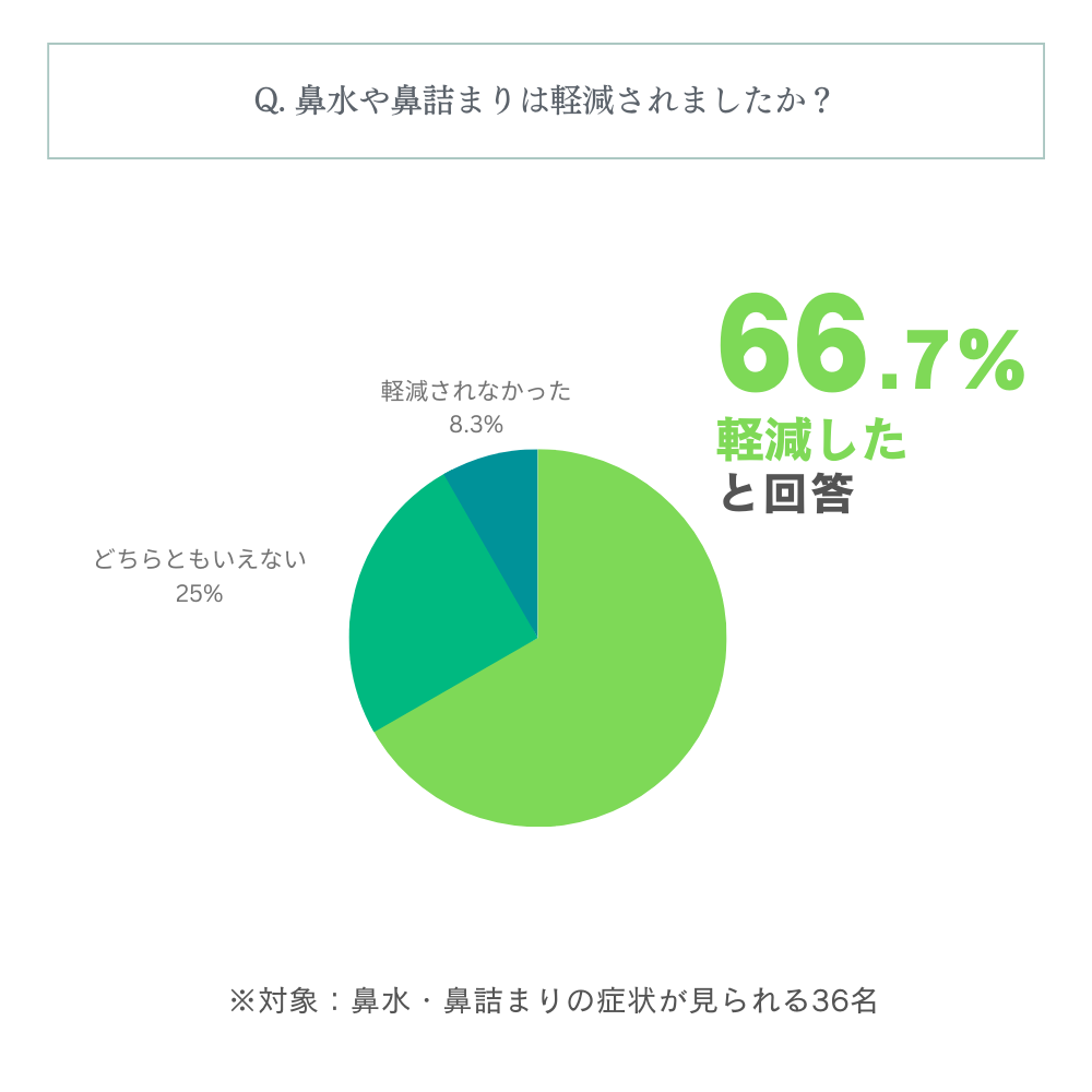 「鼻水や鼻詰まりは軽減されましたか?」という問いに対し、症状が見られる対象者の66.7%が『はい』と回答