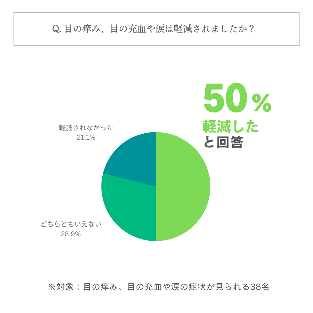「目の痒み、目の充血や涙は軽減されましたか」という問いに対し、対象者の50%が『はい』と回答。