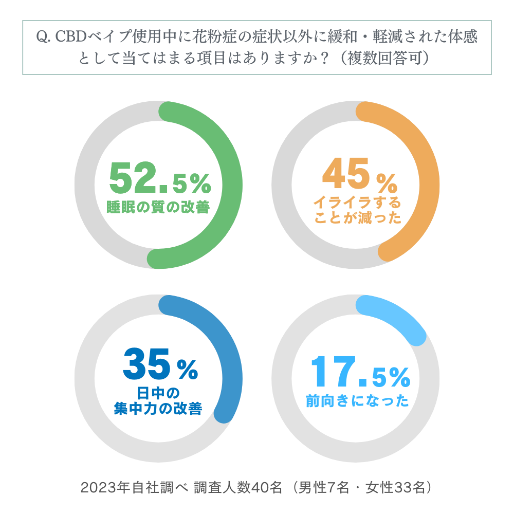 「CBDベイプ使用中に花粉症の症状以外に緩和・軽減された体感として当てはまる項目はありますか?」(複数回答可)という問いに対し、