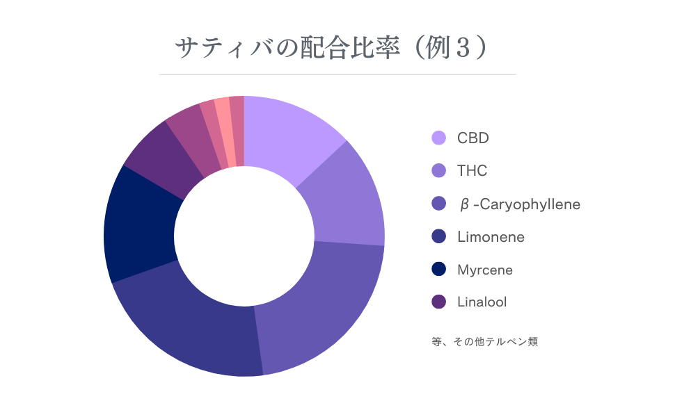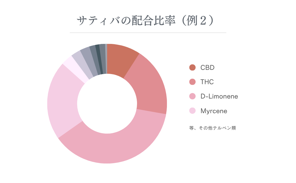 サティバは比較的THCの濃度が高く、配合されているテルペンは血行を促進させる「Dリモネン」や食欲増進効果のある「ミルセン」などが多く含まれます。