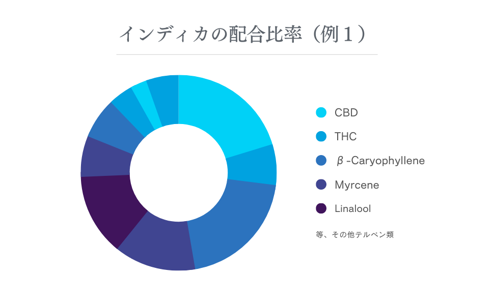 またテルペンの配合率は、ホルモンバランス調整効果が期待される「βカリオフィレン」や鎮静作用が期待される「ミルセン」、ラベンダーなどに含まれる「リナロール」など、リラックス効果の高い成分が多く含まれることが特徴です。