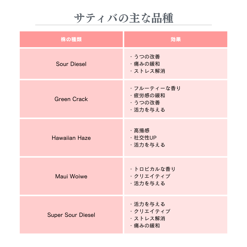 サティバの主な品種は、以下のものが挙げられます。