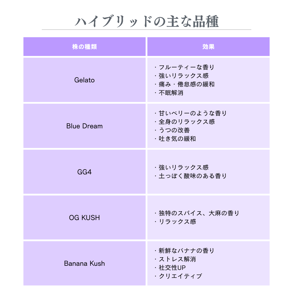 ハイブリッドはインディカとサティバのかけ合わせなので、品種によってその効果が異なります。