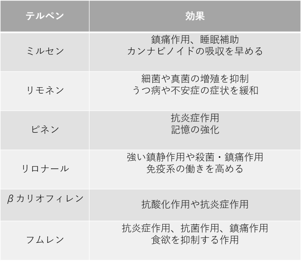 大麻に含まれるテルペンは、上記の表のような医療的な効果と、カンナビノイドの効果を増強させるアントラージュ効果により、大麻の医療的な利用において重要な役割を持っています。成分を正しく理解してより、快適なCBDライフを送れますように。