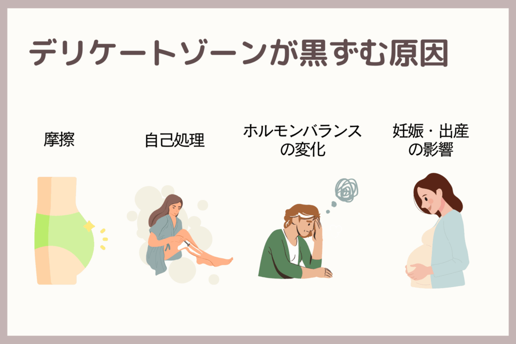 デリケートゾーンの黒ずみは、摩擦やホルモンバランス、加齢など、さまざまな要因が関わっています。