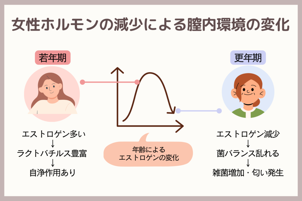 40代以降、とくに更年期にさしかかると、女性ホルモン(エストロゲン)の分泌が減少します。これにより、膣内の自浄作用を担っている「乳酸菌(ラクトバチルス)」が減少し、膣のpHバランスが乱れやすくなります。