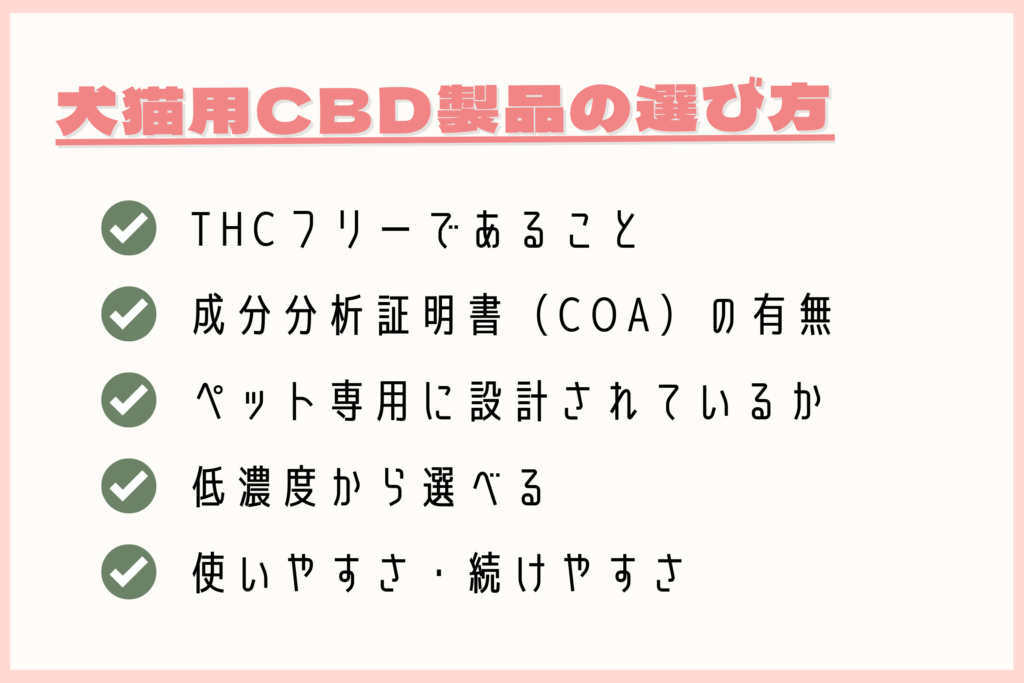 犬や猫に有害なTHC(精神作用成分)が含まれていないことを必ず確認。「THCフリー」または「ブロードスペクトラム」と明記されている製品が安心です。