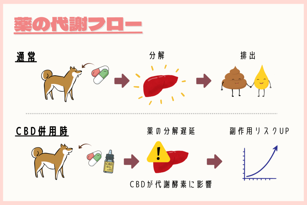 CBDと薬を同時に与えると、体内で代謝が競合しやすくなるため、2〜4時間以上の間隔を空けるのが理想です。