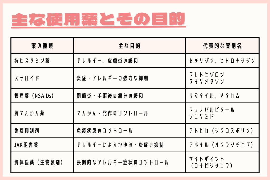 まず、犬に使用される主な薬とその目的を整理しましょう。