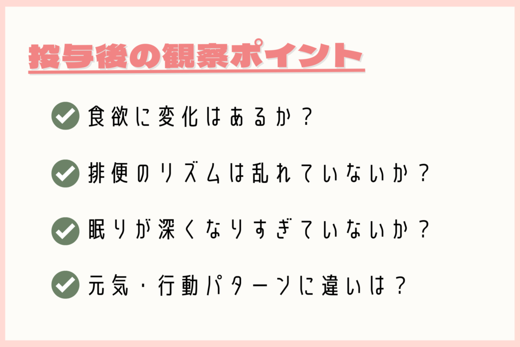 → 眠気・食欲・便の状態・行動などを日々チェックして報告