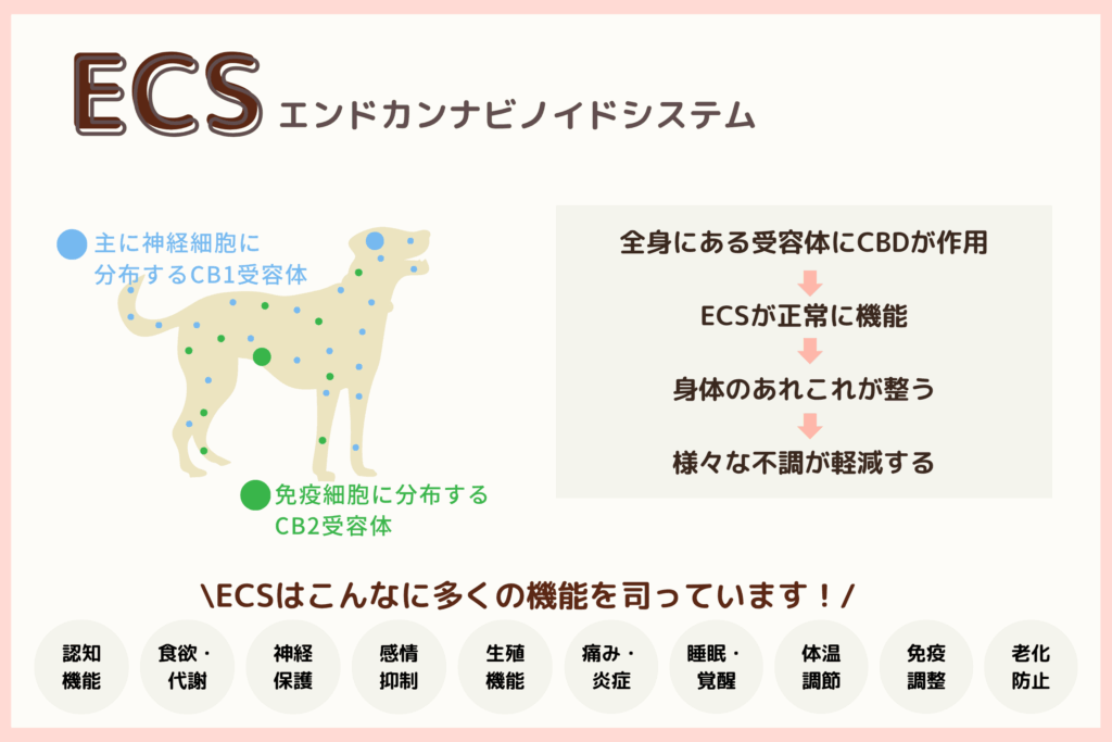 CBDが働きかけるのは、「エンド・カンナビノイド・システム(ECS)」と呼ばれる生体内の調整機能です。ECSは体内の「恒常性(ホメオスタシス)」を保つ役割があり、ストレス反応、炎症、免疫、睡眠、痛みなどに関係しています。
