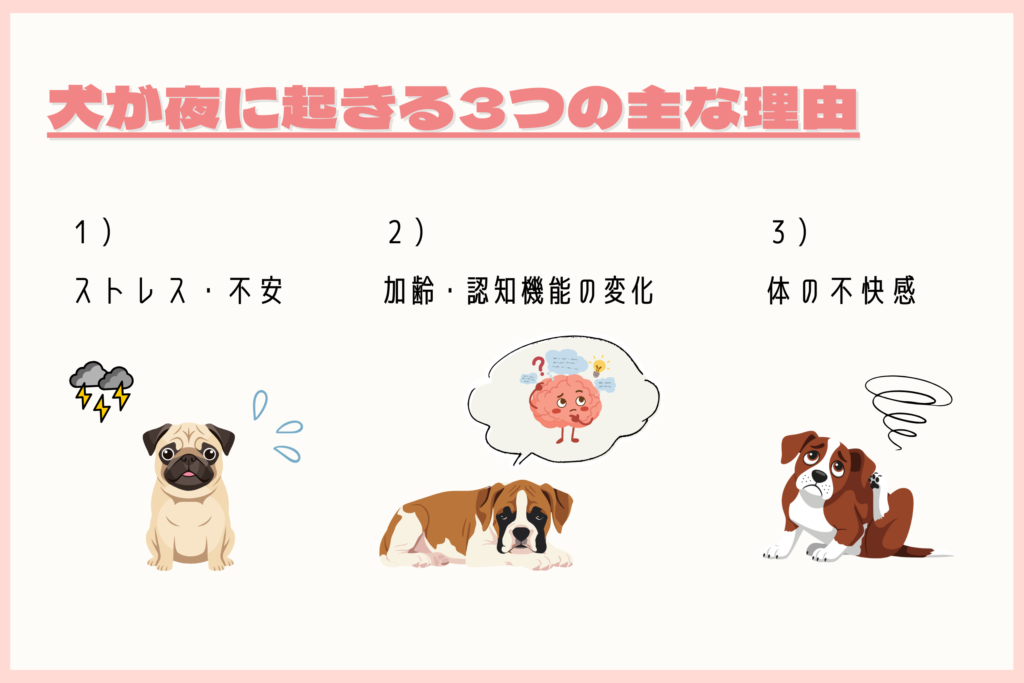 夜間に犬が起きる行動には、以下のようなさまざまな原因が考えられます。複数の要因が絡んでいることも少なくありません。