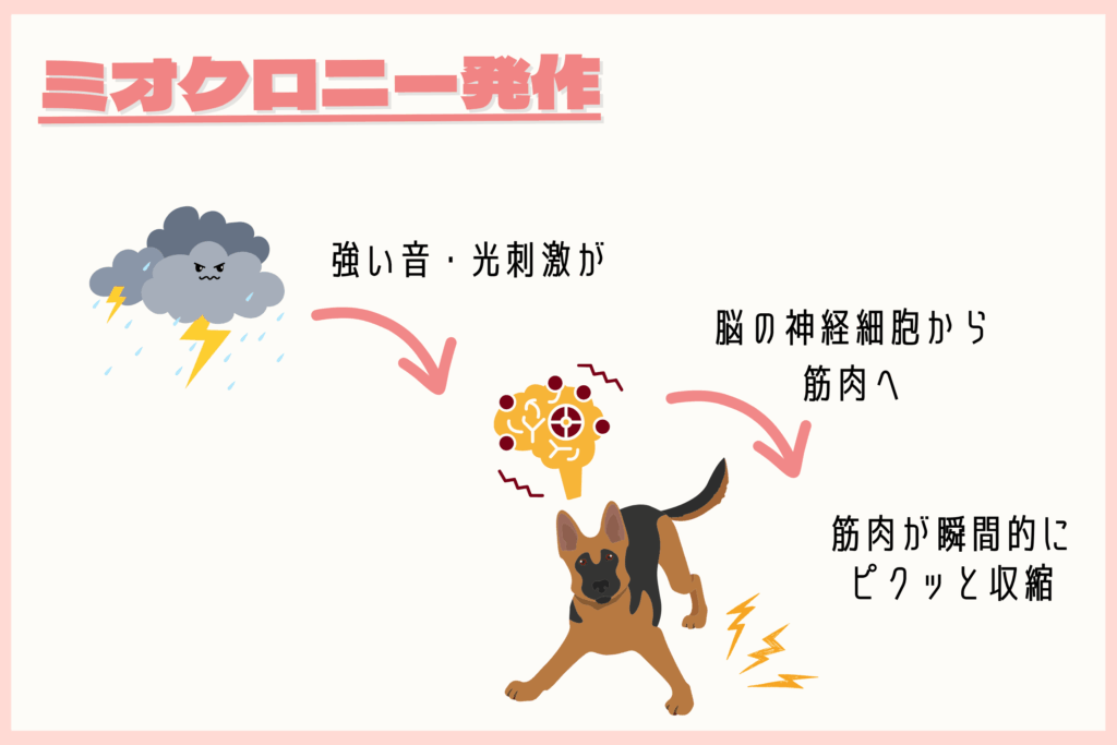 特に高齢の犬に多く見られるのが、「ミオクロニー発作」という現象。これは音や光の刺激をきっかけにして、筋肉が突発的にピクッと動く発作性の症状です。